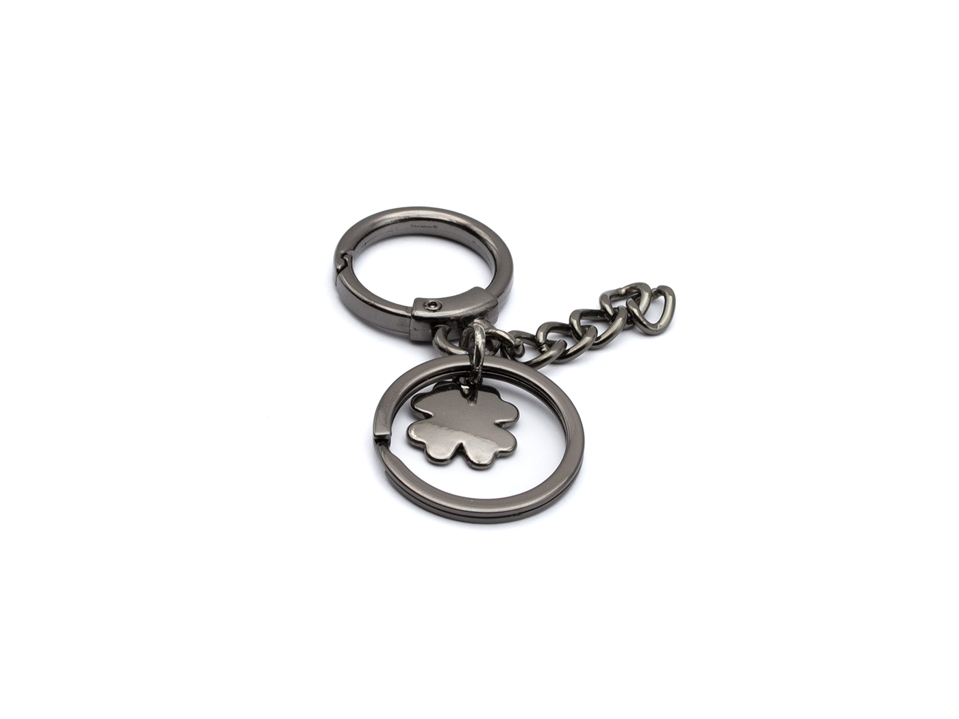 Decorative item for handbags, wallets, and leather goods, made of zinc alloy with a blued finish. 22mm snap ring. 26mm keyring.